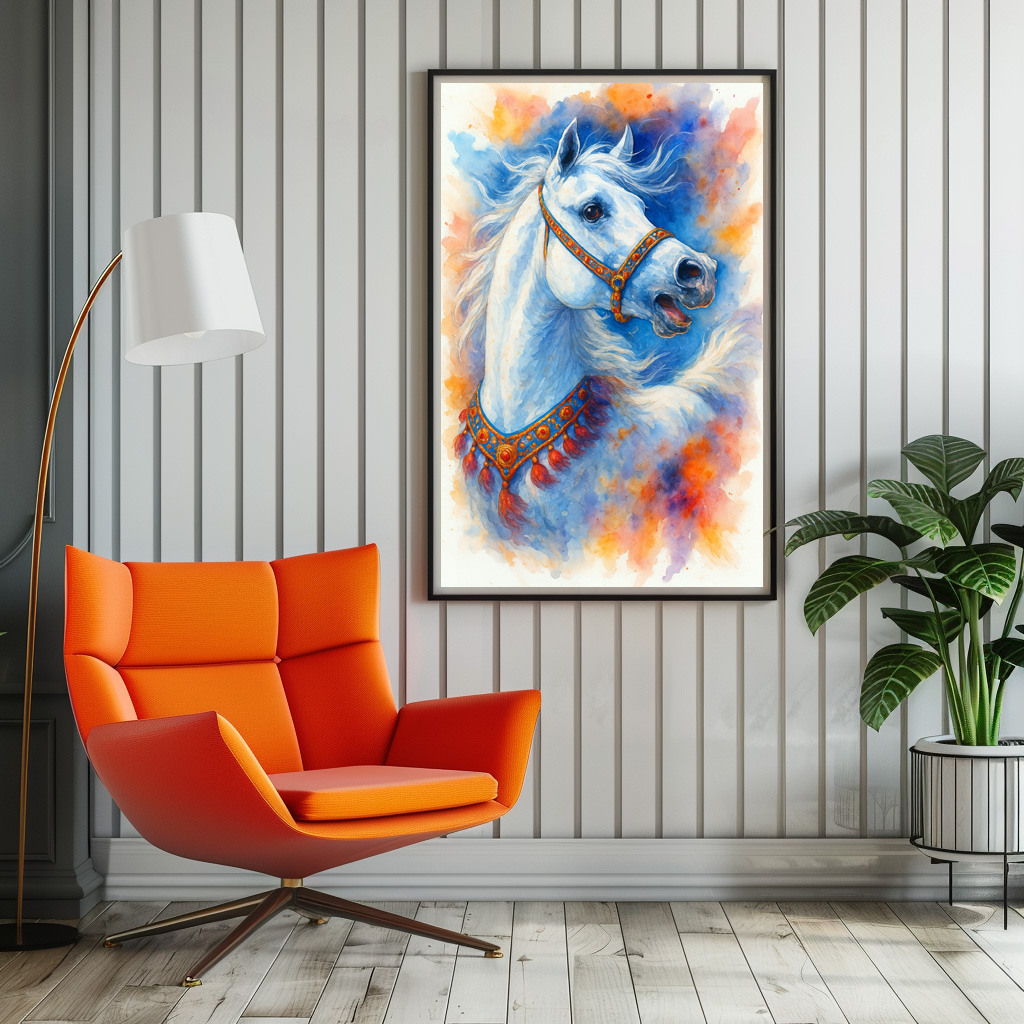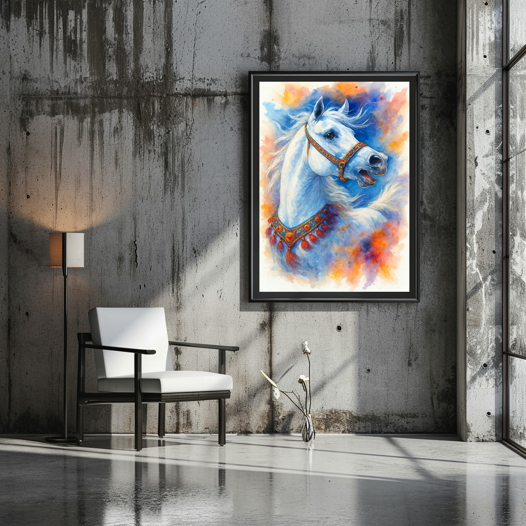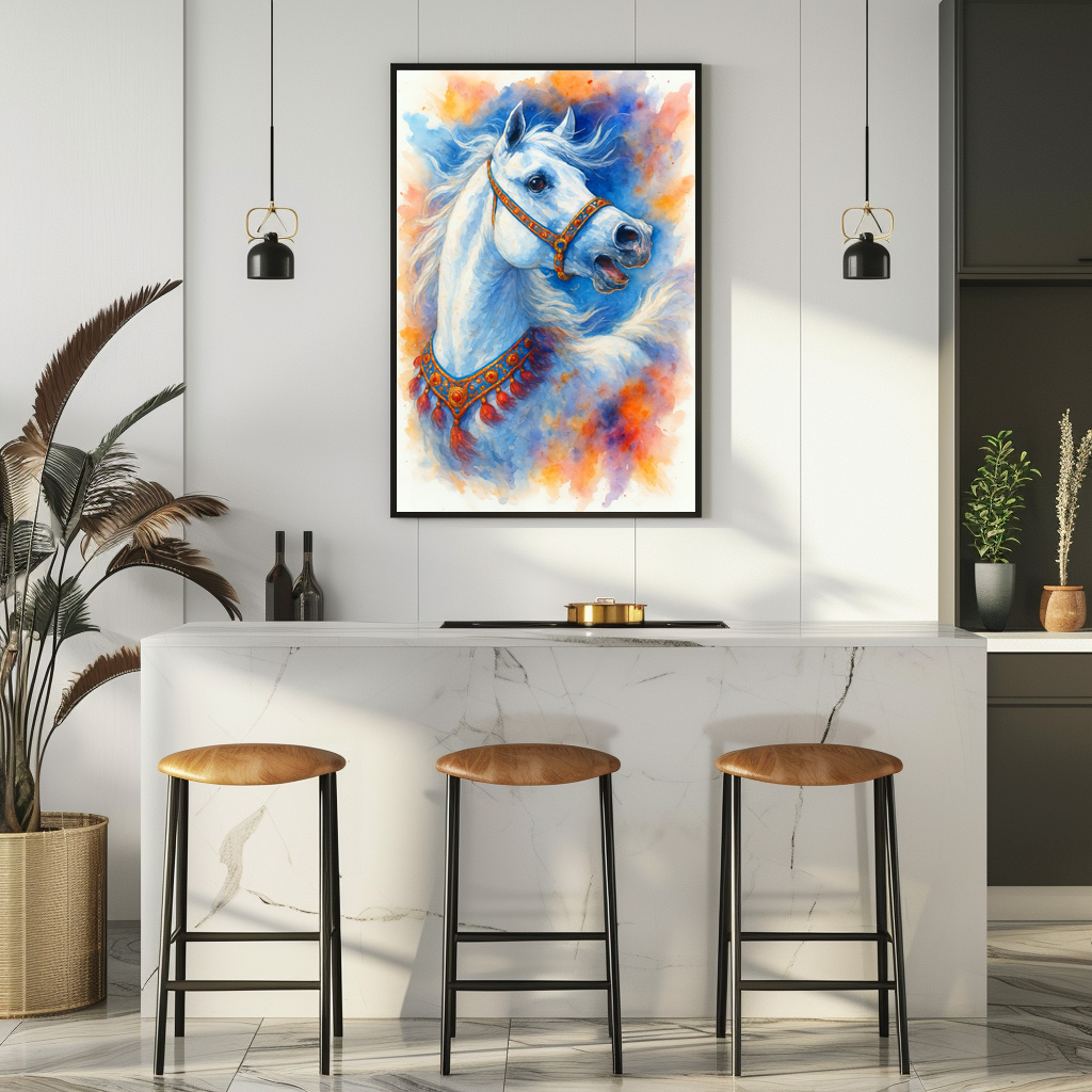 "Arabisches Pferd in traditionellem Zaumzeug" by Kerstin Waurick Portrait eines edlen arabischen Schimmels mit traditionellem Zaumzeug. In Aquarell Stil. [raxxa_pgid_content pgid=”84″]
