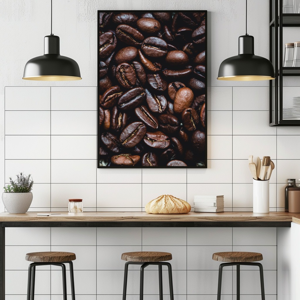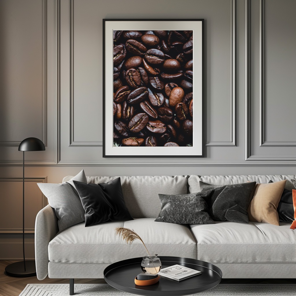 A macro photo of coffee beans is a unique and captivating piece of art that can elevate any room\s decor. By zooming in on the intricate details of the beans, the photo showcases the intricate patterns, textures, and shapes of the coffee beans, revealing a world that is often overlooked. This macro shot can also highlight the nuances of the roasting process, revealing the subtle differences in colour, size, and shape that distinguish one type of coffee from another. Moreover, the image can be printed in various sizes, making it a statement piece for any coffee lover\s home or office, and serving as a conversation starter for anyone who appreciates the beauty in the everyday.
