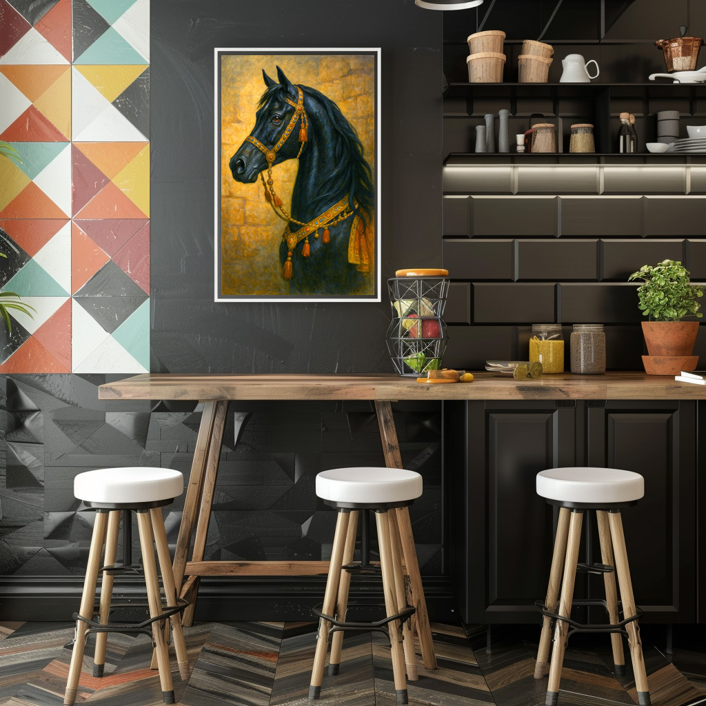 "Schwarzes arabisches Pferd" by Kerstin Waurick Edler Rappe in traditionellem Zaumzeug vor einer Mauer. Portrait. [raxxa_pgid_content pgid=”84″]