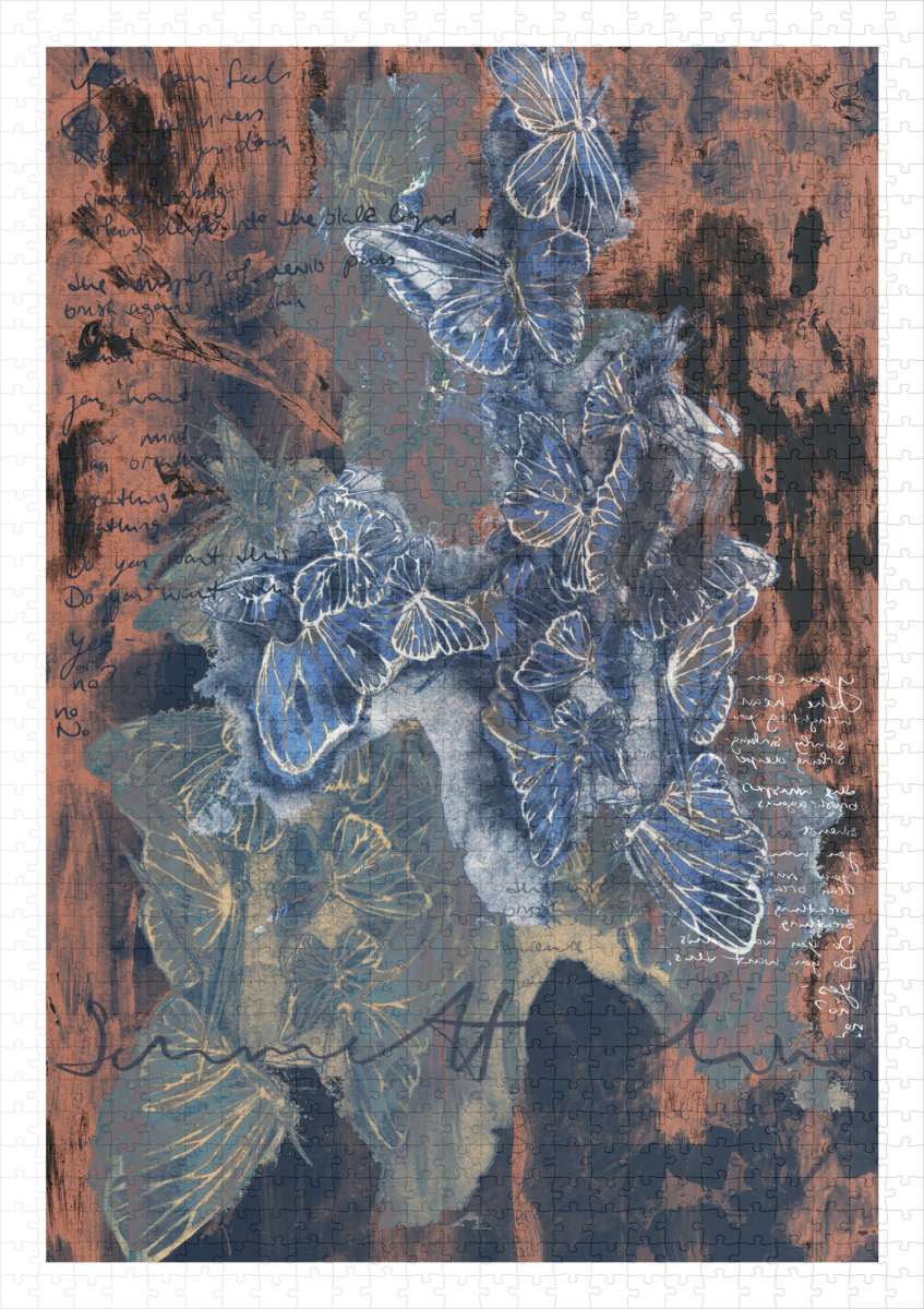 Ein in Aquarell gemalter, blau angehauchter Schwarm Schmetterlinge tritt aus einem braun-schwarzen Meer aus Rauch hervor.